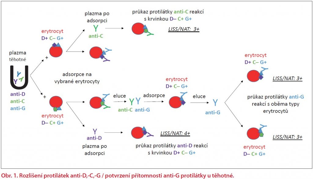 Při kontrolním imunohematologickém vyšetření v 16. týdnu gravidity reagovaly protilátky anti-D (v titru 8 000) a anti-C (v titru 4) a byla dourčena protilátka anti-G. Antigen G doprovází (zpravidla) antigen D a/nebo C, sérologicky reaguje jako anti-C+D [1,5]. Protilátka anti-G se stanovila pomocí adsorpčních a elučních testů s erytrocyty typu D+C-G+ a D-C+G+, jak znázorňuje obr. 1. Další protilátka se během těhotenství již neobjevila.